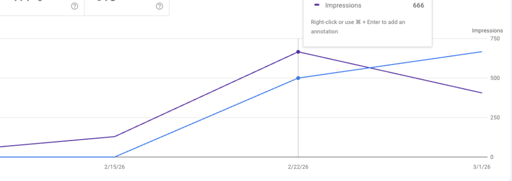 Within 48 hours of publishing, impressions spiked. All six posts indexed rapidly, and the site started appearing on page one for several educational queries around fabric weight and t-shirt quality. The graph speaks for itself.