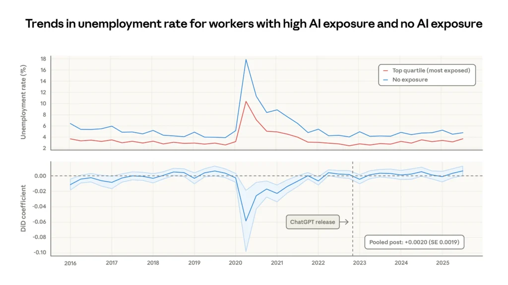 Anthropic’s own findings state there has been no systematic increase in unemployment for highly AI-exposed workers since late 2022. The researchers found only suggestive evidence that hiring of younger workers has slowed slightly in exposed occupations, and even that finding is barely statistically significant.